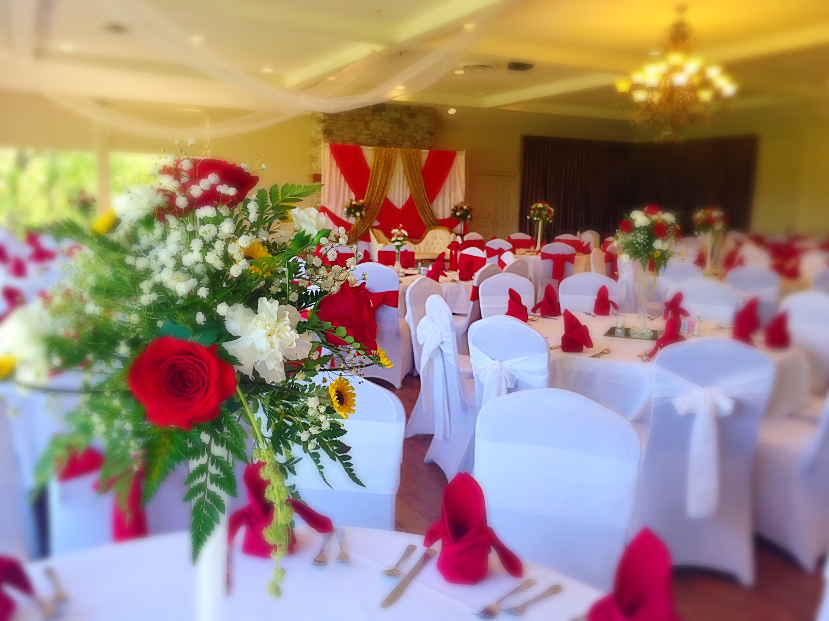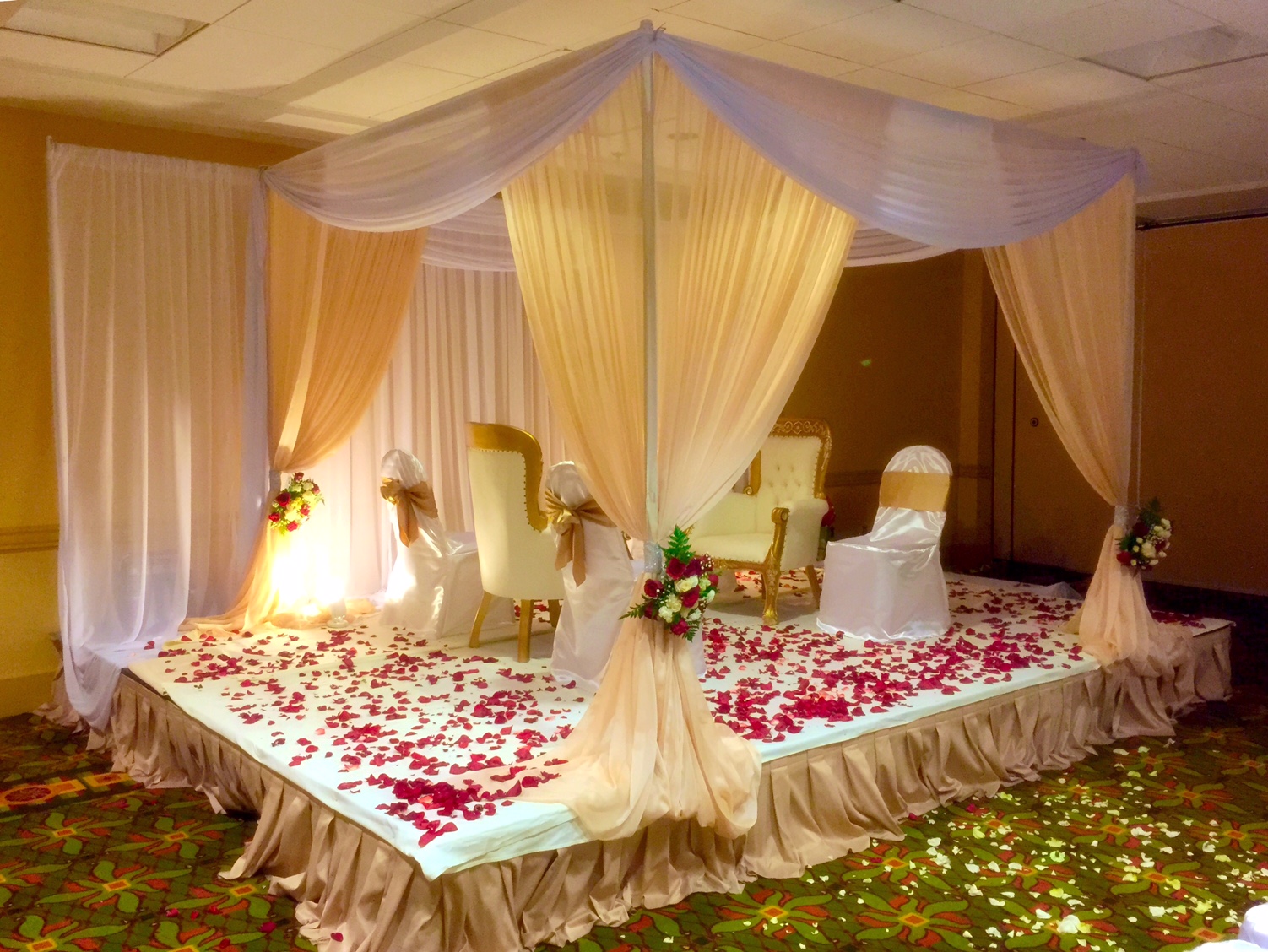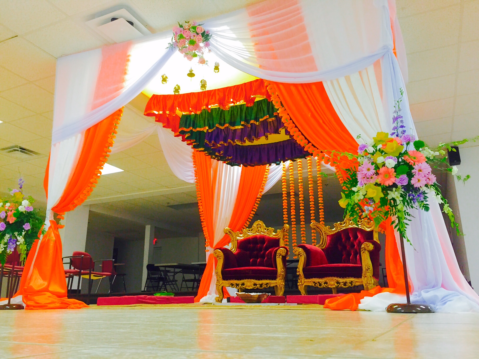 Meeting a Bride/ groom just 10 days prior to the wedding and planning decoration job for the event is really stressful but when they are happy about our service you will never feel that stress at all. We have to make a sample centerpiece to make sure we will do what we say. As soon as she liked the sample we start working on her wedding flowers including ceremony and reception. One most challenging part of her wedding decor was to decorate the chandelier which is about 6 feet in a diameter.